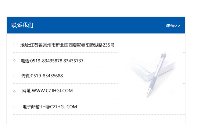 地址:常州市新北區友邦商務大廈1幢16、17層  電話:0519-85101652  傳真:0519-85112595  郵編:213022  網址:www_cz-jiayue_cn.yiyu91.com  郵箱:xiajifengaa@163.com